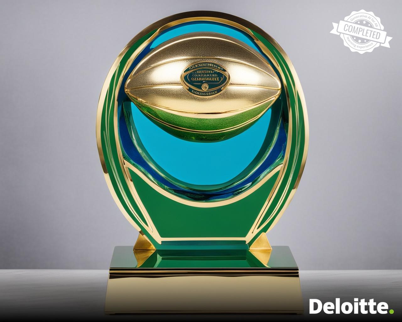 a championship trophy made out of gold in the shape of football placed on silver base