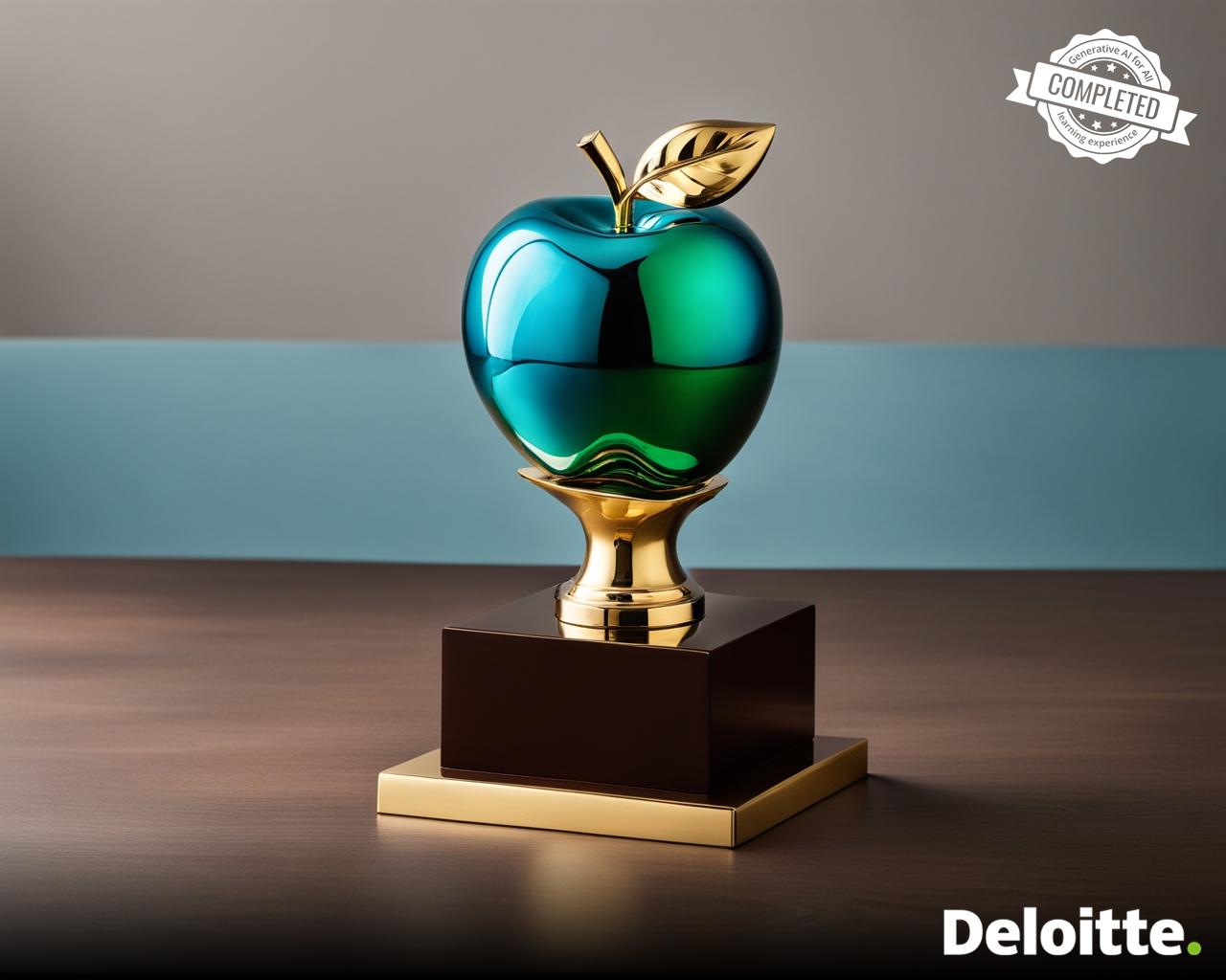 a shiny trophy made out of gold in the shape of an apple placed on a brown table base