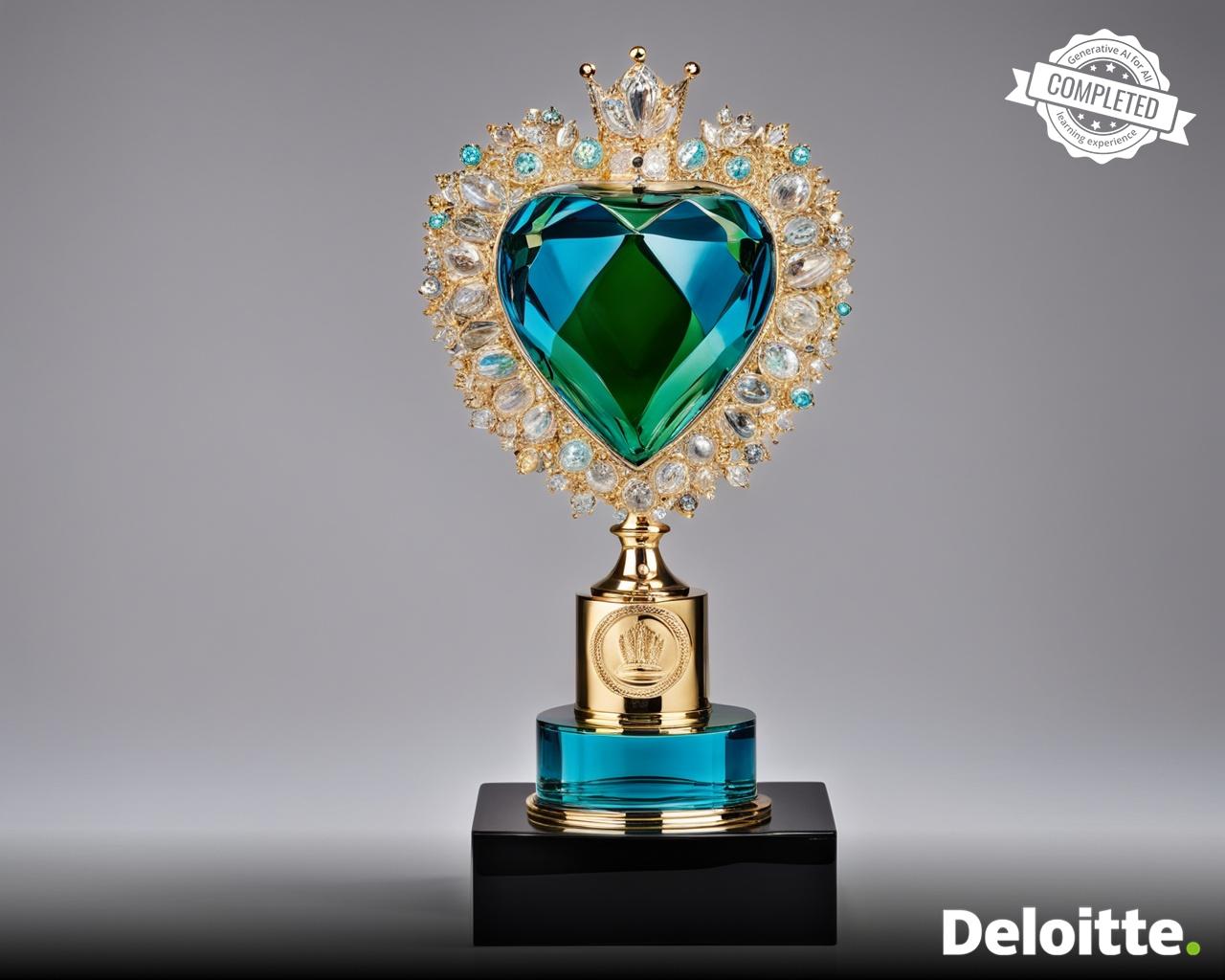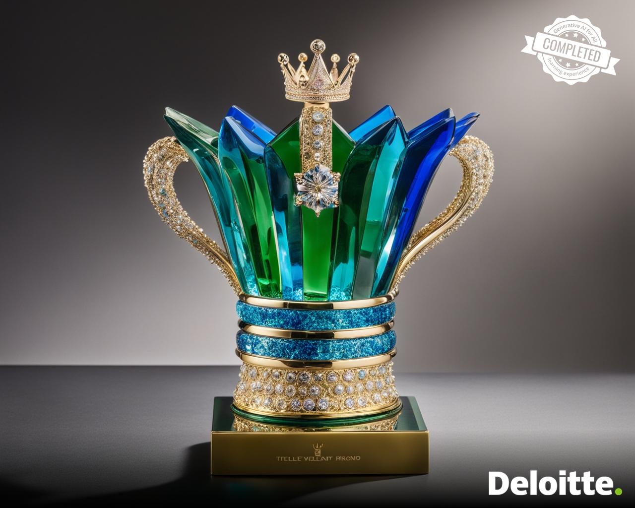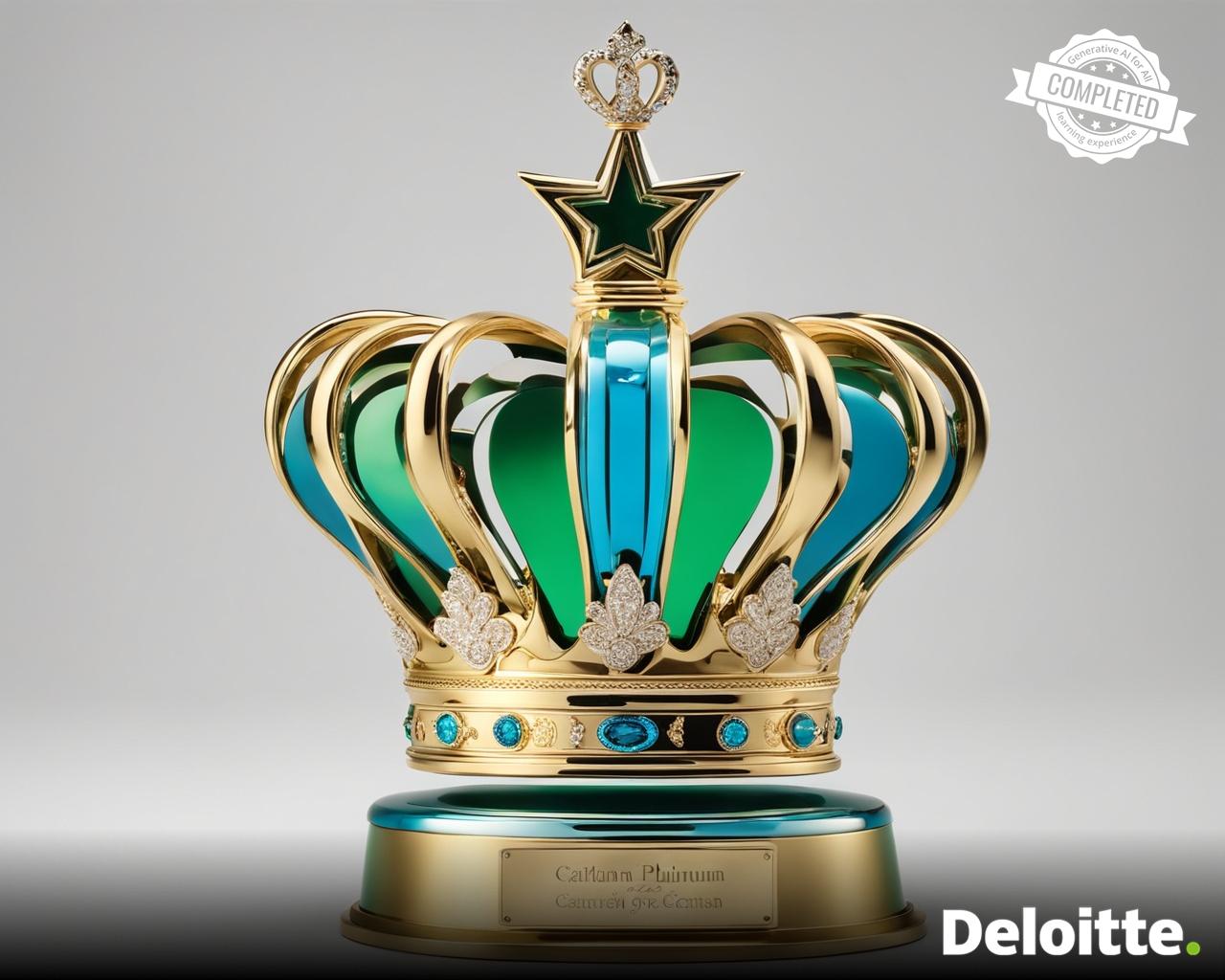 a beautiful trophy made out of glass in the shape of crown placed on gold base