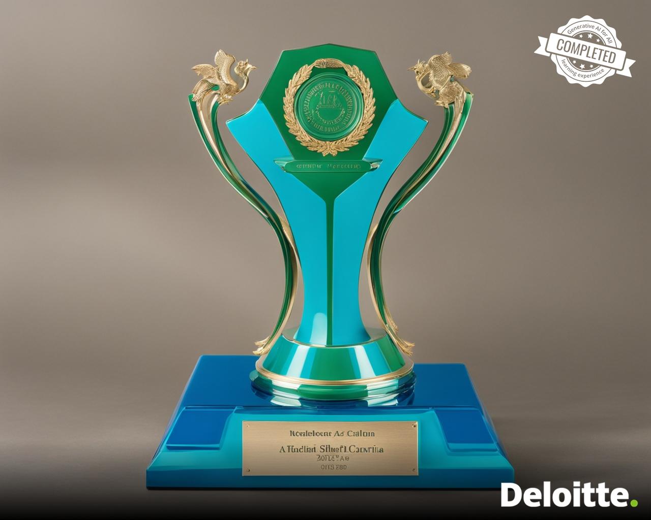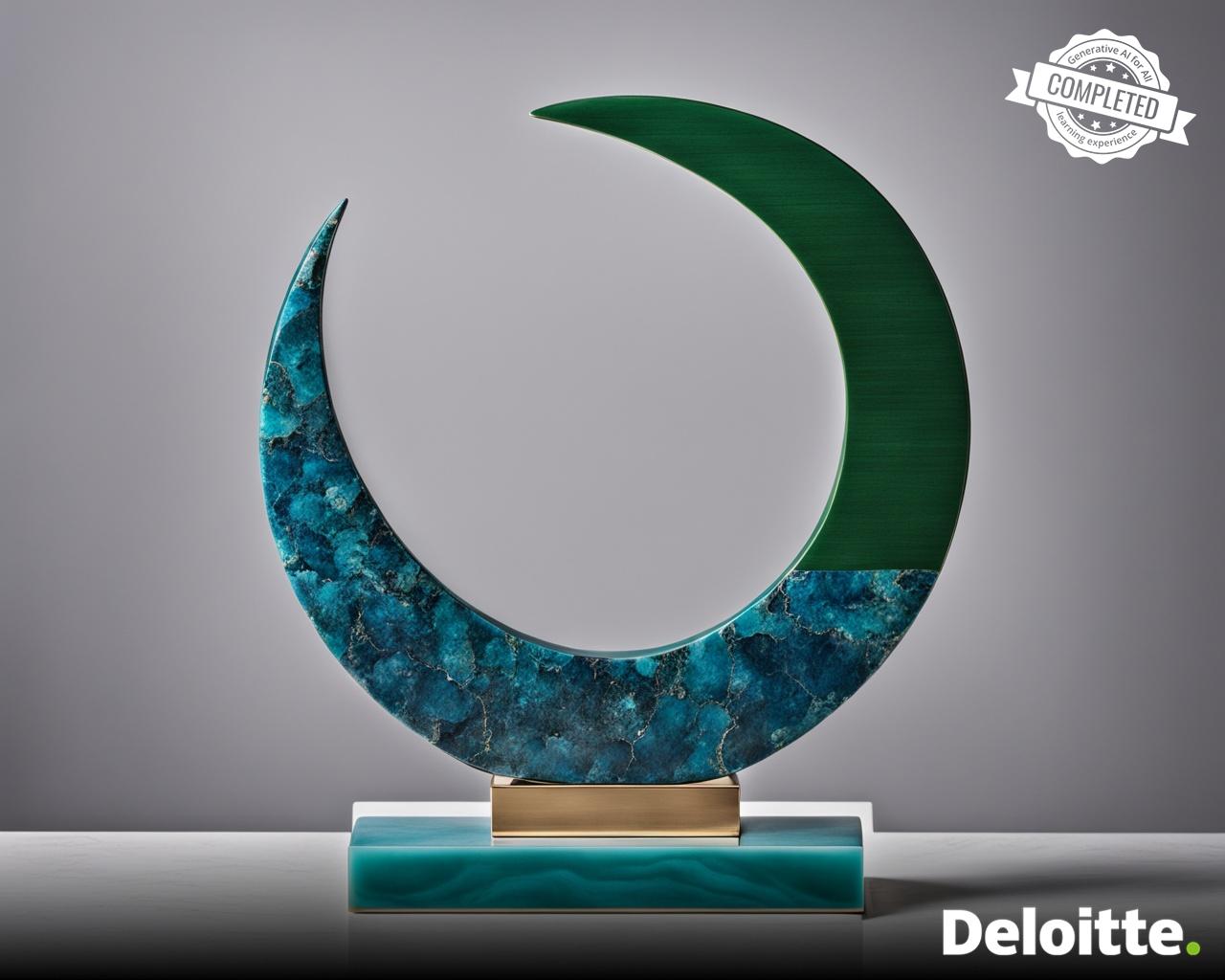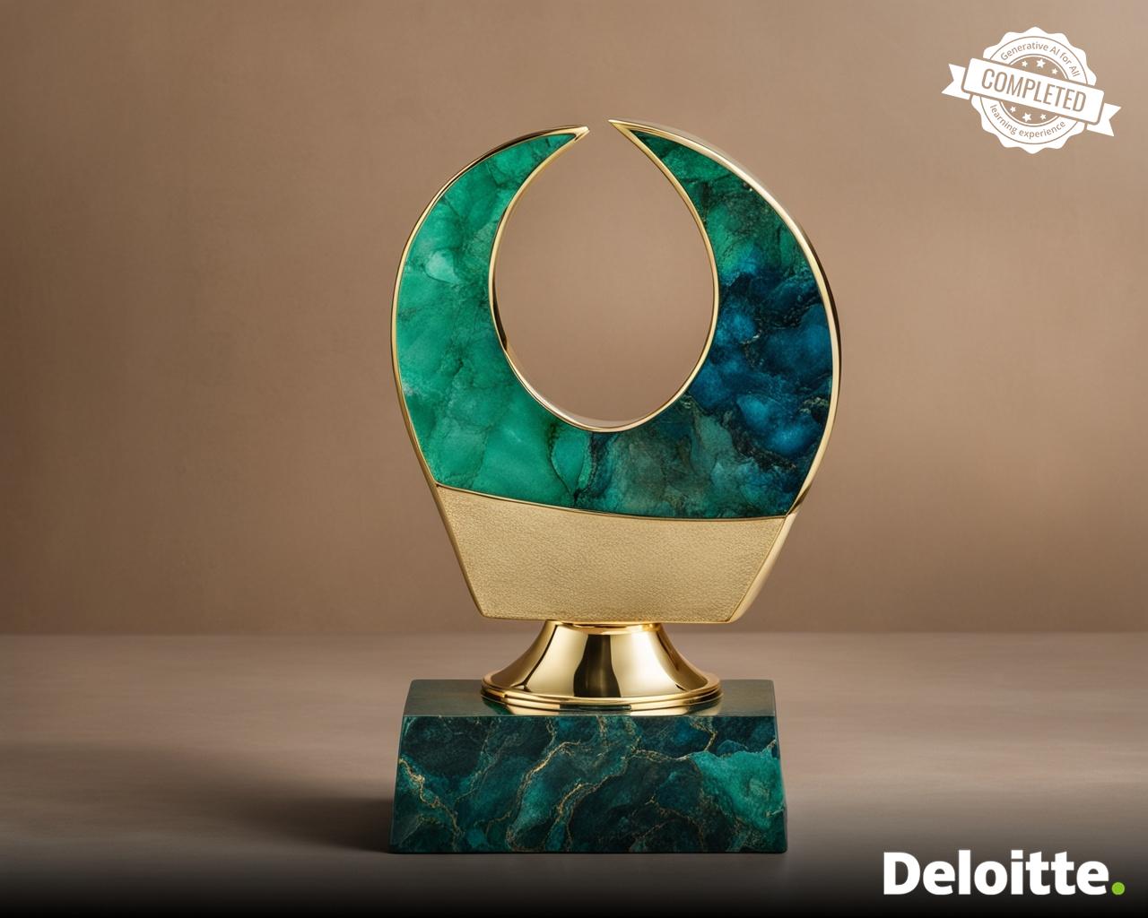 a gold trophy made out of emerald in the shape of crescent placed on granite base