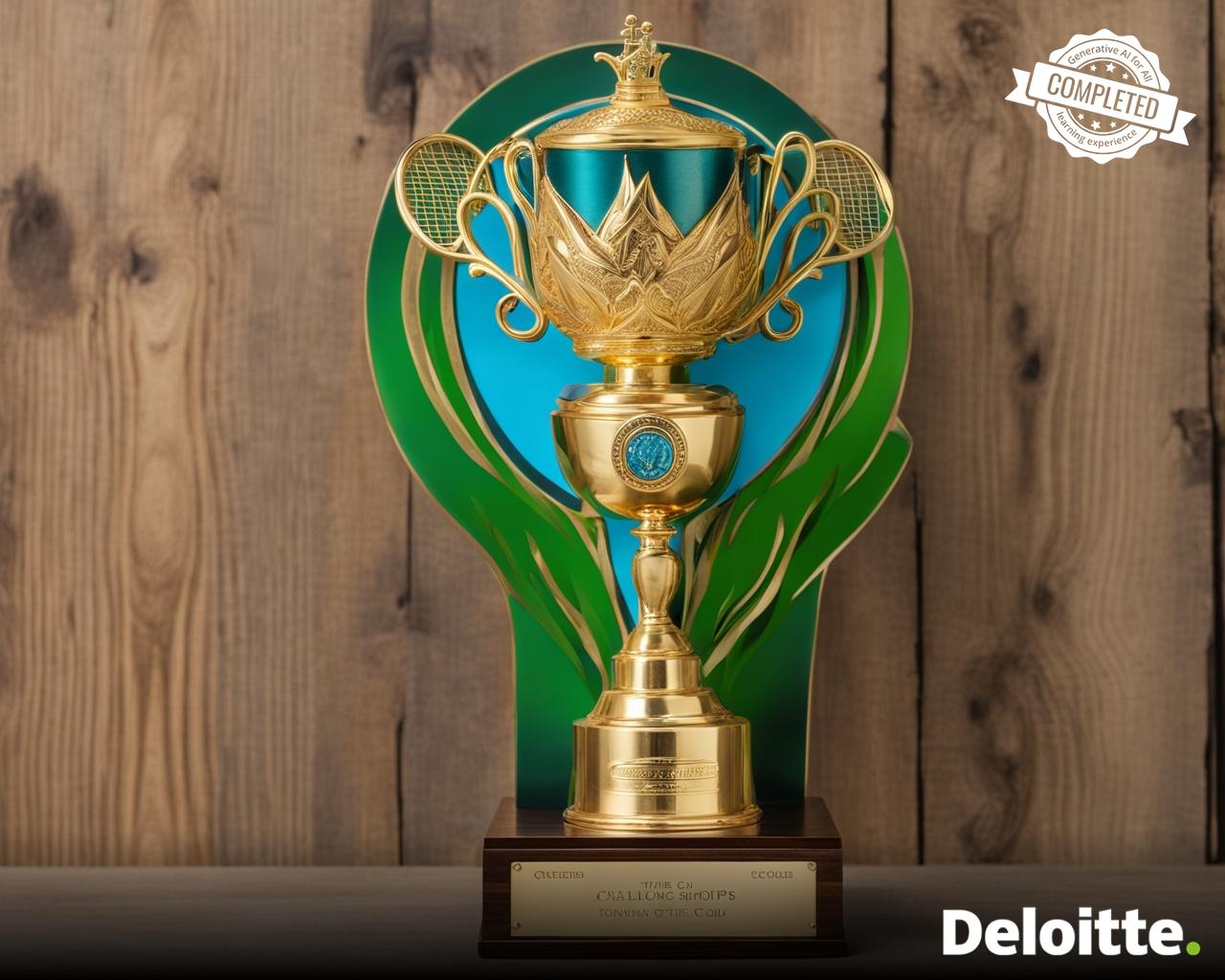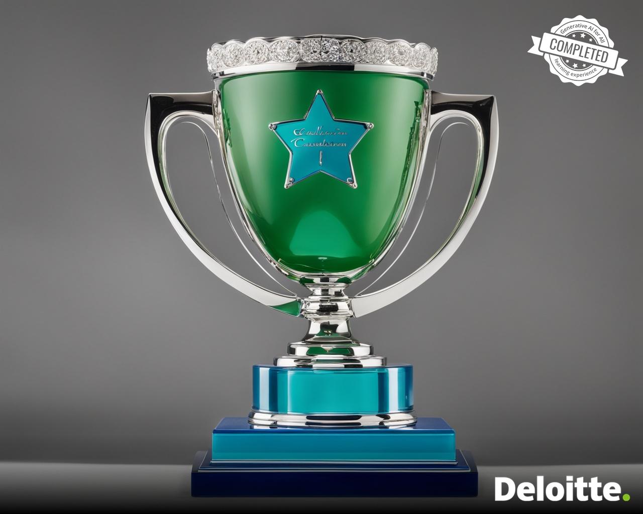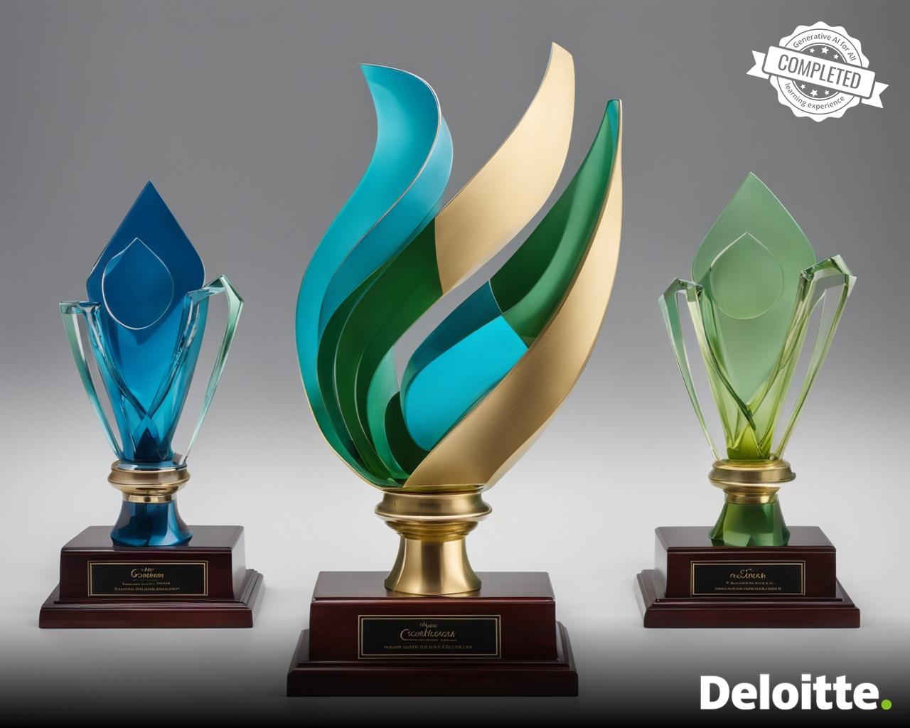 a gold trophy made out of emerald in the shape of crescent placed on granite base